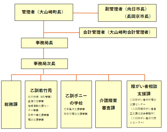 当事務組合は障がいのある方を対象とした、指定特定相談支援事業、就労継続支援(B型)事業、生活介護事業、地域活動支援センター事業、日中一時支援事業の「乙訓若竹苑」、発達の遅れ等が懸念される幼児を対象とした、障害児通所支援と障害児相談支援を行う「乙訓ポニーの学校」、介護保険法における要介護認定の二次審査と障害者総合支援法における障害支援区分の二次審査等を行っている「介護障害審査課」、乙訓圏域障がい者総合相談支援センター(乙訓圏域障がい者自立支援協議会事務局)、乙訓障がい者虐待防止センター、乙訓障がい者基幹相談支援センターを設置している「障がい者相談支援課」、「総務課」の5部署の運営・活動を行っています。