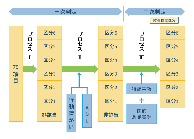 障害程度区分は、下記の図のように、大きく3つのプロセスを経て判定されます。